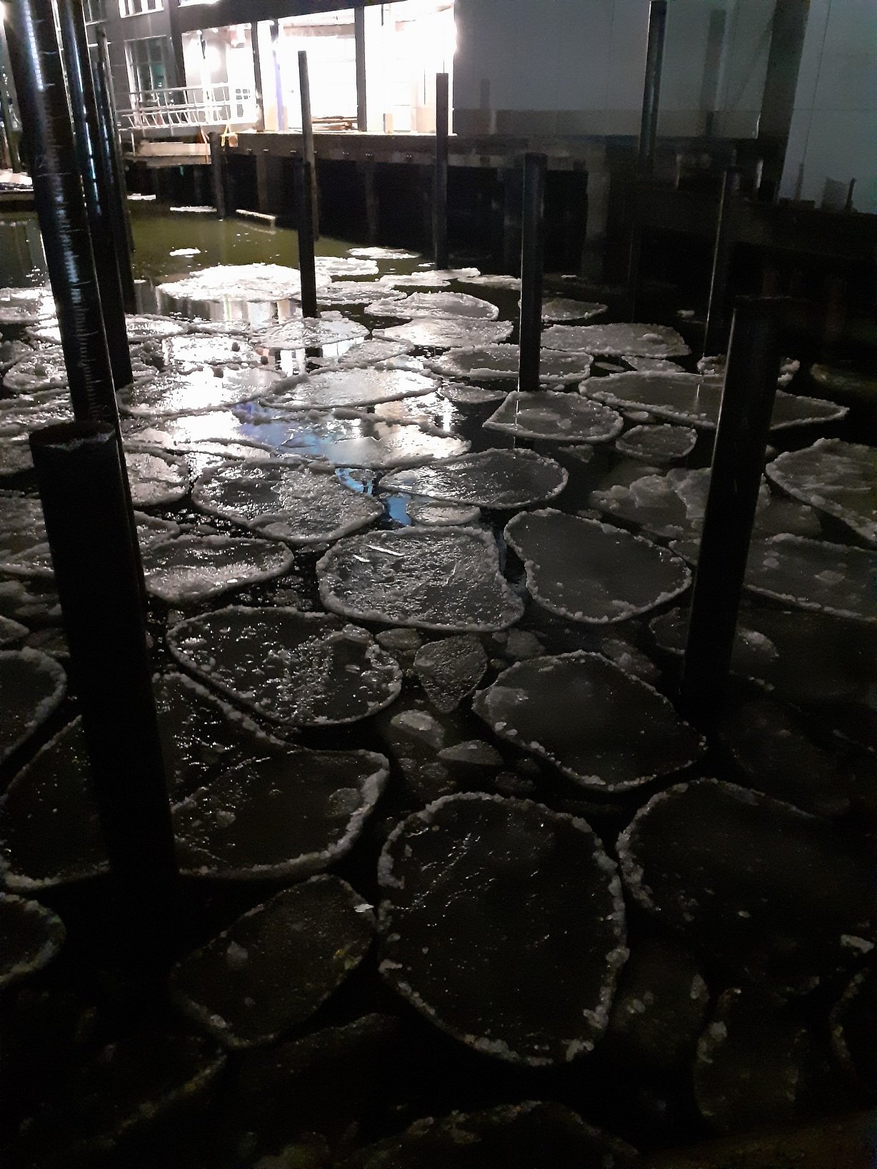 It was dark, but in the water below I could see these glistening round ice circles. They were mesmerizing. It was cold, but I couldn’t stop looking at them.